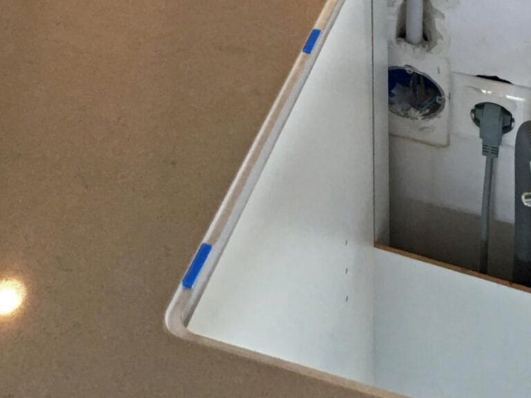 - Tejpa kanten på urtaget på bänkskivan med maskeringstejp (extra viktigt för Natursten och Komposit med matt yta)! På detta sätt minimerar du risken för silikonfläckar som är mycket svåra att få bort från bänkskivan.
